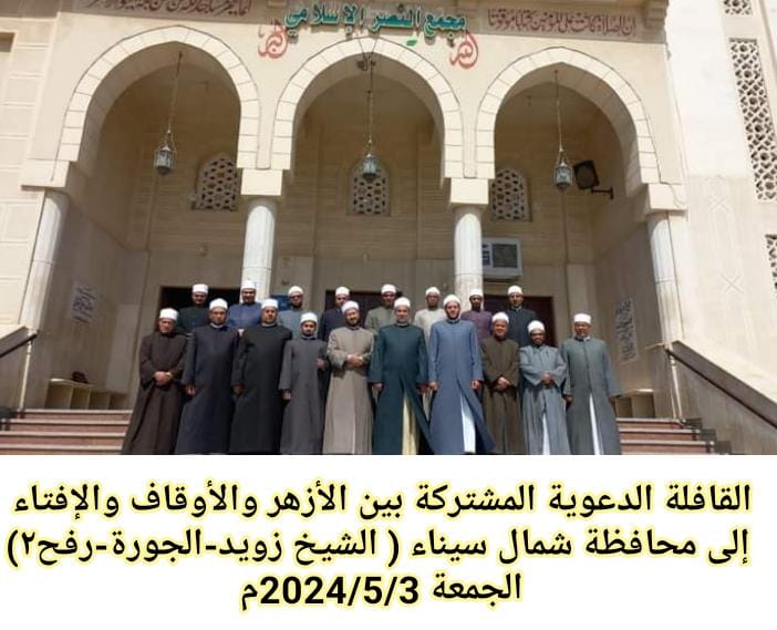 في إطار التعاون المشترك والتنسيق المستمر بين وزارة الأوقاف والأزهر الشريف ودار الإفتاء المصرية وبرعاية كريمة من فضيلة الإمام الأكبر الأستاذ الدكتور/ أحمد الطيب شيخ الأزهر، ومعالي وزير الأوقاف الأستاذ الدكتور/ محمد مختار جمعة، وفضيلة الأستاذ الدكتور/ شوقي علام مفتي الديار المصرية، قافلة دعوية مشتركة بين الأزهر الشريف والأوقاف ودار الإفتاء المصرية إلى محافظة (شمال سيناء)، يومي الخميس والجمعة : (23 – 24 شوال 1445هـ)، الموافق(2- 3/5/2024م)، وتضم ثلاثة من علماء الأزهر الشريف، وثمانية من علماء وزارة الأوقاف، واثنين من أمناء الفتوى بدار الإفتاء المصرية، ليتحدثوا جميعًا بصوت واحد حول موضوع: “أمانة العامل والصانع وإتقانهما”.
