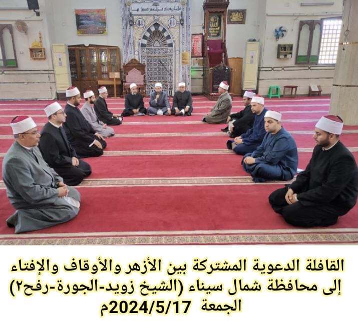 في إطار التعاون المشترك والتنسيق المستمر بين وزارة الأوقاف والأزهر الشريف ودار الإفتاء المصرية وبرعاية كريمة من فضيلة الإمام الأكبر الأستاذ الدكتور/ أحمد الطيب شيخ الأزهر، ومعالي وزير الأوقاف الأستاذ الدكتور/ محمد مختار جمعة، وفضيلة الأستاذ الدكتور/ شوقي علام مفتي الديار المصرية، قافلة دعوية مشتركة بين الأزهر الشريف و الأوقاف ودار الإفتاء المصرية إلى محافظة(شمال سيناء)، يومي الخميس والجمعة : (9 – 10 ذو القعدة 1445هـ)، الموافق(16- 17/ 5/ 2024م)،، وتضم ثلاثة من علماء الأزهر الشريف، وثمانية من علماء وزارة الأوقاف، وأمين من أمناء الفتوى، وباحث شرعي بدار الإفتاء المصرية، ليتحدثوا جميعًا بصوت واحد حول موضوع: “واجبنا تجاه المنافع المشتركة والأماكن والمرافق العامة”.