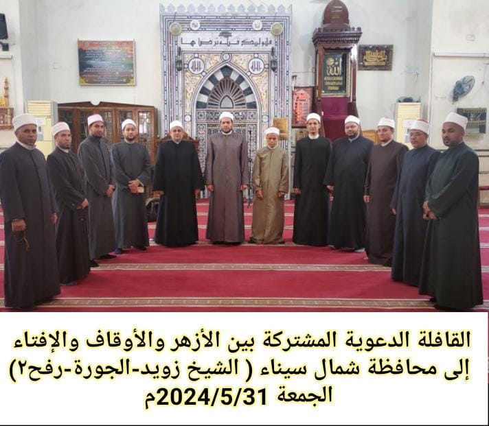 في إطار التعاون المشترك والتنسيق المستمر بين وزارة الأوقاف والأزهر الشريف ودار الإفتاء المصرية وبرعاية كريمة من فضيلة الإمام الأكبر الأستاذ الدكتور/ أحمد الطيب شيخ الأزهر، ومعالي وزير الأوقاف الأستاذ الدكتور/ محمد مختار جمعة، وفضيلة الأستاذ الدكتور/ شوقي علام مفتي الديار المصرية، قافلة دعوية مشتركة بين الأزهر الشريف و الأوقاف ودار الإفتاء المصرية إلى محافظة(شمال سيناء)، يومي الخميس والجمعة : (22 – 23 ذو القعدة 1445هـ)، الموافق (30- 31/5/2024م)، ، وتضم ثلاثة من علماء الأزهر الشريف ، وثمانية من علماء وزارة الأوقاف ، واثنان من أمناء الفتوى بدار الإفتاء المصرية ، ليتحدثوا جميعًا بصوت واحد حول موضوع: “الحقوق المتعلقة بالمال”.