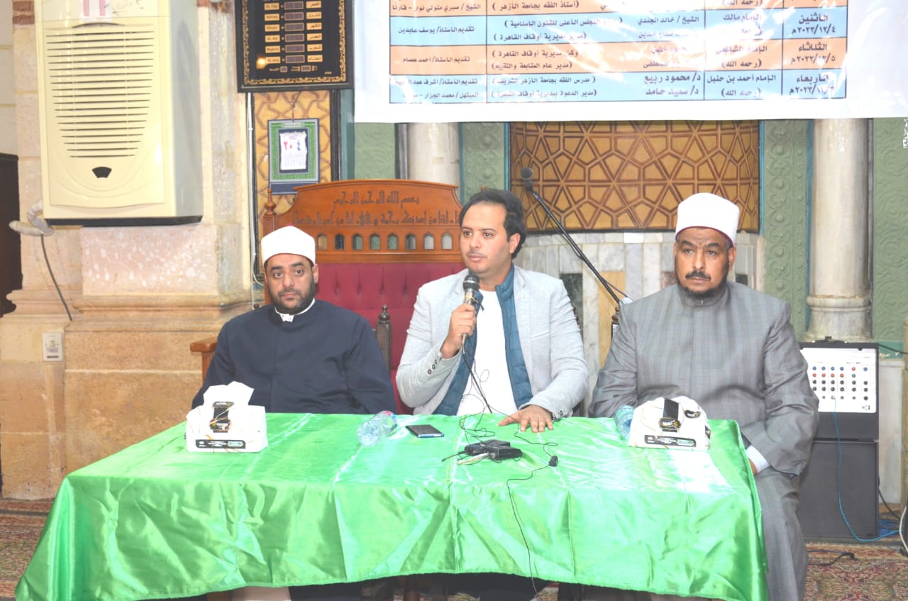 في إطار الدور التثقيفي الذي تقوم به وزارة الأوقاف فعاليات اليوم الثالث للأسبوع الدعوي بمسجد الإمام الشافعي (رضي الله عنه) بالقاهرة اليوم الثلاثاء 5/ 12/ 2023م بعنوان: “الإمام الشافعي (رحمه الله)”، حاضر فيه الدكتور/ عمرو مصطفى مدير عام المتابعة والتقييم، والدكتور/ محمود خليل وكيل مديرية أوقاف القاهرة، وقدم له الأستاذ/ أحمد عصام، وبحضور جمع غفير من رواد المسجد.