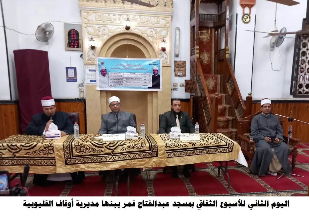 وفي مديرية أوقاف القليوبية أقيم الأسبوع الثقافي بمسجد عبد الفتاح قمر ببنها، حاضر فيه د/ محمد السيد متولي المدرس بجامعة الأزهر الشريف، الدكتور/ عبد الرحمن رضوان عبد الرحمن مدير الدعوة، والقارئ الشيخ/ شعبان عبد المحسن شعبان قارئًا، والمبتهل الشيخ/ أحمد محمد عاطف مبتهلًا، بحضور جمع غفير من رواد المسجد.