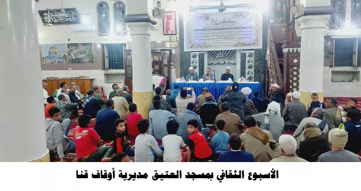وفي مديرية أوقاف قنا أقيم الأسبوع الثقافي بمسجد العتيق، حاضر فيه د/ سيد هريدي مدرس الفقه بجامعة الأزهر، والدكتور/ محمد مغربي إبراهيم إمام وخطيب ومدرس، وقدم له الشيخ/ علي مصطفى إمام وخطيب المسجد، والقارئ الشيخ/ مصطفى يس عباس قارئا ومبتهلًا، بحضور جمع غفير من رواد المسجد.