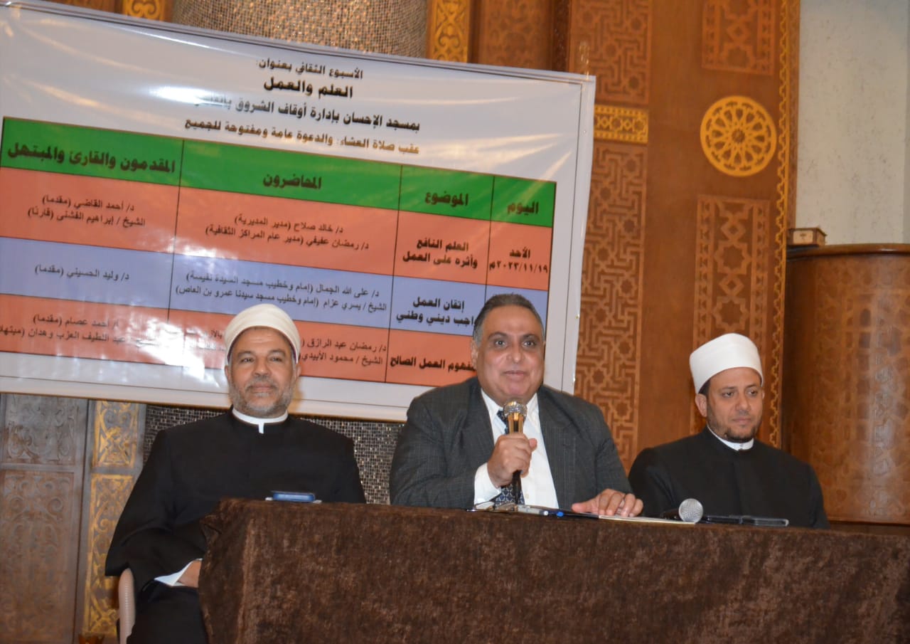في إطار الدور التثقيفي الذي تقوم به وزارة الأوقاف انطلقت فعاليات الأسبوع الدعوي بمسجد الإحسان بالشروق بمحافظة القاهرة اليوم الأحد 19/ 11/ 2023م بعنوان: “العلم النافع وأثره على العمل”، حاضر فيه الدكتور/ خالد صلاح الدين مدير مديرية أوقاف القاهرة، والدكتور/ رمضان عفيفي مدير عام المراكز الثقافية، وقدم له الدكتور/ أحمد القاضي المذيع بإذاعة القرآن الكريم، وكان فيه القارئ الشيخ/ أحمد صقر قارئا، وبحضور الدكتور/ محمود خليل وكيل مديرية أوقاف القاهرة، والدكتور/ منتصف عبد المهيمن مدير الإدارات، والشيخ/ أسامة محمود جبريل مدير إدارة أوقاف الشروق وبدر، والشيخ/ محمود عبد الباقي مدير إدارة أوقاف النزهة، والشيخ/ علاء فوزي المفتش بالإدارة، وجمع غفير من رواد المسجد.
