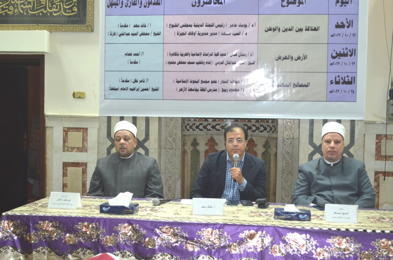 في إطار الدور التثقيفي الذي تقوم به وزارة الأوقاف انطلقت فعاليات الأسبوع الثقافي من مسجد مصطفى محمود بالمهندسين الأحد 22/ 10/ 2023م تحت عنوان: “العلاقة بين الدين والوطن” حاضر فيه الأستاذ الدكتور/ السيد مسعد مدير مديرية أوقاف الجيزة، والشيخ/ محمد الدومي إمام وخطيب مسجد مصطفى محمود بالمهندسين، وقدم له الأستاذ/ خالد سعد المذيع بالتلفزيون المصري، وكان فيه القارئ الشيخ/ مصطفى السيد عبد النبي قارئًا، وبحضور الدكتور/ أحمد أبو طالب مسئول الإرشاد الديني بمديرية أوقاف الجيزة، والشيخ/ محمد حسين قاسم مدير الإدارات، والشيخ/سيد عمارة المنسق الإعلامي بالمديرية، والشيخ/ محسن عبد الظاهر مدير إدارة أوقاف شمال الجيزة، والشيخ/ حسين الشافعي المفتش بالإدارة، وجمع غفير من رواد المسجد.