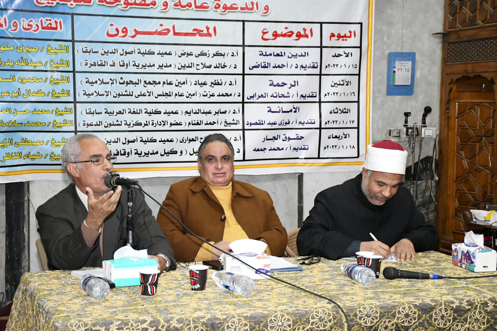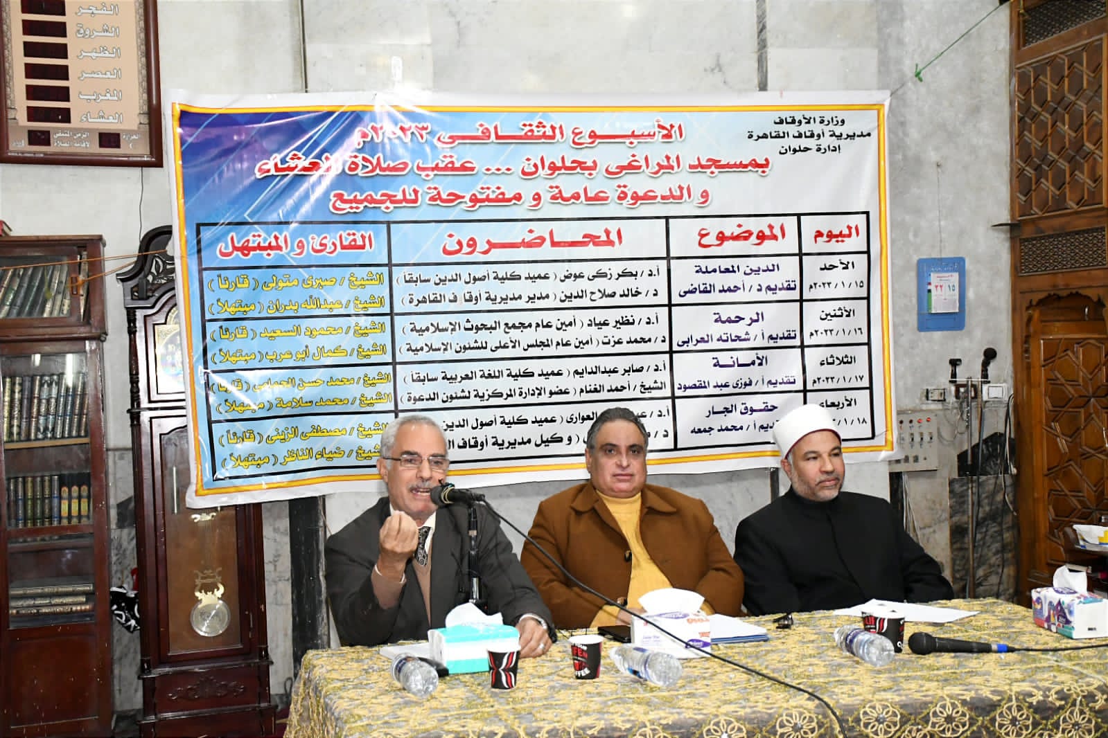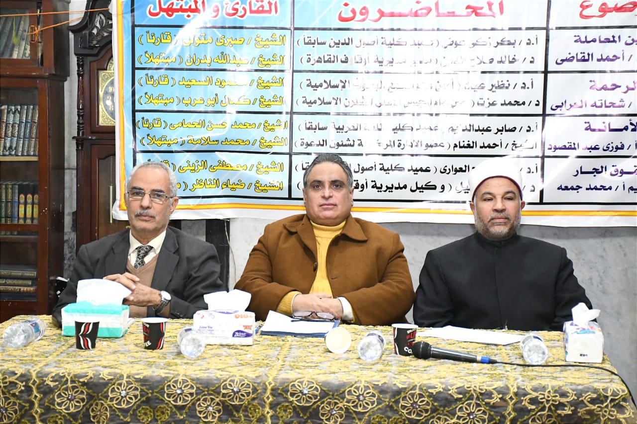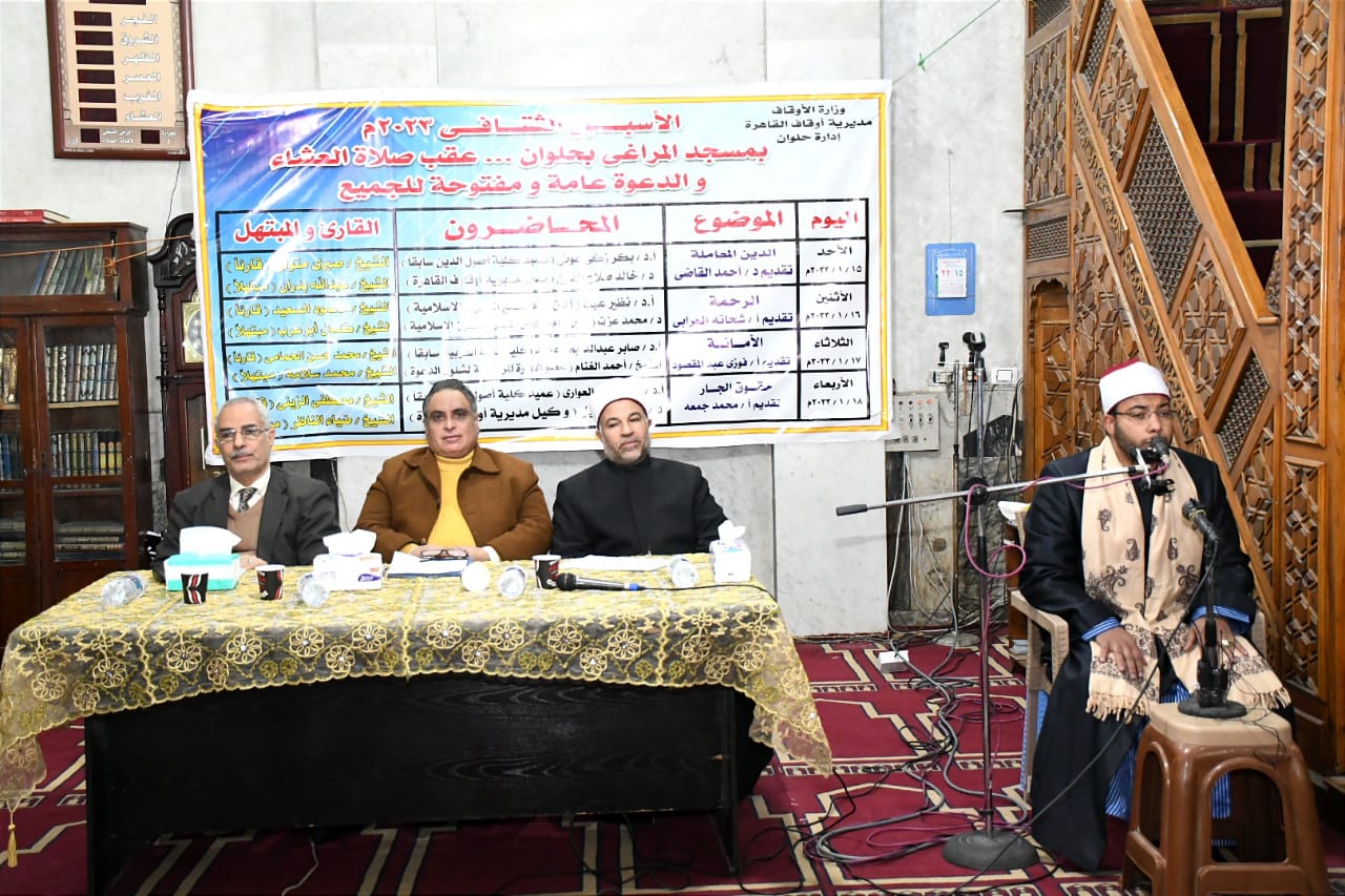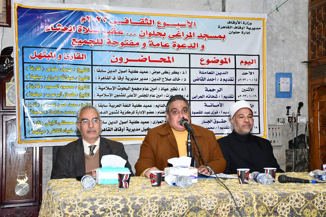 في إطار الدور التثقيفي الذي تقوم به وزارة الأوقاف انطلقت فعاليات اليوم الأول للأسبوع الدعوي بمسجد المراغي بمدينة حلوان اليوم الأحد 15/ 1/ 2023م بعنوان: “الدين المعاملة”، حاضر فيه الأستاذ الدكتور/ بكر زكي عوض عميد كلية أصول الدين سابقًا، والدكتور خالد صلاح الدين مدير مديرية أوقاف القاهرة، وقدم له د/ أحمد القاضي المذيع بإذاعة القرآن الكريم، وكان فيه القارئ الشيخ/ صبري متولي قارئًا، والمبتهل الشيخ/ عبدالله بدران مبتهلا، وبحضور الدكتور/ سعيد حامد مبروك مدير الدعوة بمديرية أوقاف القاهرة، والشيخ/ كامل محمد أحمد مدير إدارة حلوان, والدكتور ياسر معروف مدير إدارة المعادي، والشيخ/ محمد حسن مدير إدارة حدائق حلوان، والشيخ/ طاهر ناصف مدير إدارة مدينة 15مايو، ومجموعة من السادة أئمة الإدارة، وجمع غفير من رواد المسجد.