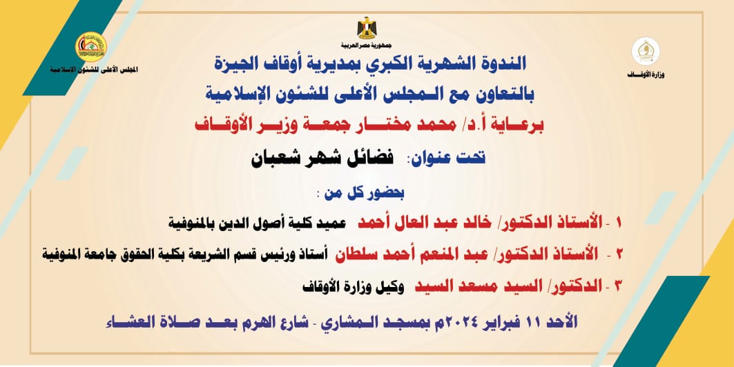 في إطار تكثيف وزارة الأوقاف لبرامجها الدعوية والتثقيفية تنطلق “الندوة الشهرية الكبرى” بمديرية أوقاف الجيزة بالتعاون مع المجلس الأعلى للشئون الإسلامية، وذلك برعاية أ.د/ محمد مختار جمعة وزير الأوقاف، بعنوان: “فضائل شهر شعبان” وتقام هذه الندوة بمسجد “المشاري ” بشارع الهرم، الأحد القادم ١١ فبراير ٢٠٢٤م، الموافق ١ من شعبان ١٤٤٥هــ، عقب صلاة العشاء مباشرة، ويحاضر في هذه الندوة كل من: