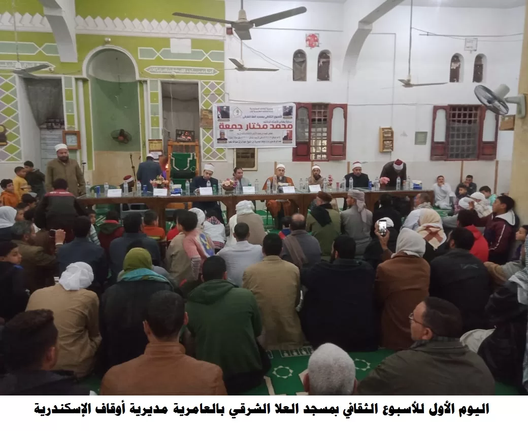 ففي مديرية أوقاف الإسكندرية أقيم الأسبوع الثقافي بمسجد العلا الشرقي بالعامرية، حاضر فيه د/ علي نوح شعبان خلف الله مدرس مساعد بكلية اللغة العربية بالقاهرة، والشيخ/ عبد الله عادل الصاوي إمام وخطيب ومدرس، والقارئ الشيخ/ عبد الرازق عبد الله طليب قارئا، والمبتهل الشيخ/ حسن محمد حسن مبتهلًا، بحضور الشيخ/ عبد الرازق عبد الله عبد الرازق مدير إدارة أوقاف العامرية، وجمع غفير من رواد المسجد.