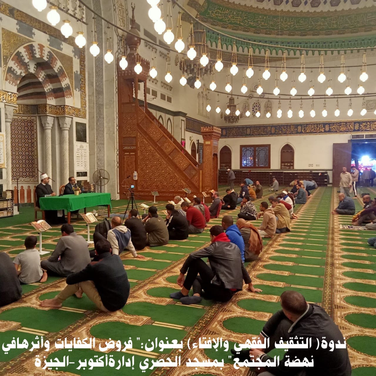 في إطار دور وزارة الأوقاف في نشر الفكر الوسطي المستنير، وفي ضوء نشاطها الدعوي والعلمي والتثقيفي، أقيمت مساء السبت 9/ 12/ 2023م، بعد صلاة العشاء: “ندوات الإفتاء والتثقيف الفقهي” حول موضوع: “فروض الكفاية وأثرها على الفرد”، وقد أكد الجميع أن فرض الكفاية أمر مهم يقصد في الشرع تحصيله على جهة الإلزام، من غير تعيين فاعله، وفي علم فروع الفقه هو: المفروض شرعًا من غير تعيين فاعله، فيثاب فاعله، وإذا تركه الجميع أثموا، وإذا فعله البعض كفى، ويسمى فرض كفاية لأن فعل البعض يكفي لحصول المقصود، ومثل ذلك صلاة الجنازة، وغيرها من فروض الكفاية، وقد جاءت الندوات على النحو التالي: