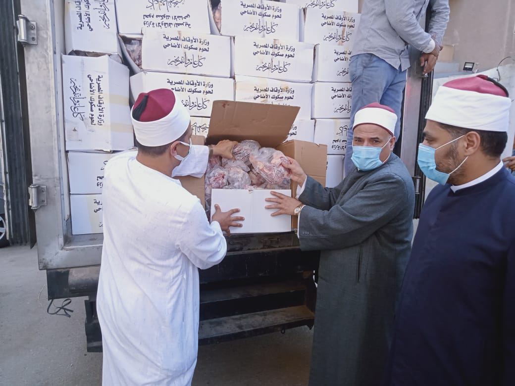 ( المنيا- كفر الشيخ- الدقهلية- القليوبية ) أربع سيارات تحمل لحوم أضاحي الأوقاف بواقع ( 4 ) أطنان لكل محافظة ، لتوزيع اللحوم على المستحقين الحقيقيين من الأسر الأولى بالرعاية ، وذلك للأسبوع الثاني عشر من بدء مرحلة التوزيع ، ليصبح إجمالي ما تم توزيعه ( 1285 ) طنًّا من لحوم أضاحي الأوقاف.