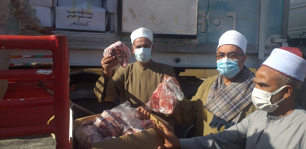 ( سوهاج- قنا- الأقصر- أسوان- السويس ) خمس سيارات تحمل لحوم أضاحي الأوقاف بواقع (4) أطنان لمحافظتي ( سوهاج- قنا ) و ( 2 ) طن لكل من محافظات ( الأقصر- أسوان- السويس ) ، لتوزيع اللحوم على المستحقين الحقيقيين من الأسر الأولى بالرعاية ، وذلك للأسبوع الثاني عشر من بدء مرحلة التوزيع ، ليصبح إجمالي ما تم توزيعه ( 1312 ) طنًّا من لحوم أضاحي الأوقاف.