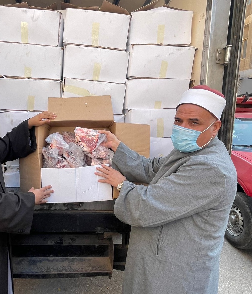 ( كفر الشيخ- الفيوم- الدقهلية- البحيرة ) أربع سيارات تحمل لحوم أضاحي الأوقاف بواقع ( 4 ) أطنان لكل محافظة ، لتوزيع اللحوم على المستحقين الحقيقيين من الأسر الأولى بالرعاية ، وذلك للأسبوع الحادي عشر من بدء مرحلة التوزيع ، ليصبح إجمالي ما تم توزيعه ( 1184 ) طنًّا من لحوم أضاحي الأوقاف.