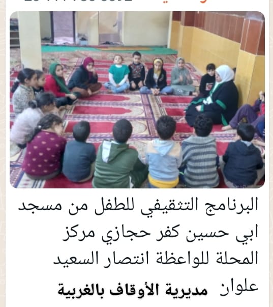 في إطار استعادة المسجد لدوره في بناء الوعي، واستمرارًا لجهود وزارة الأوقاف في تكثيف الأنشطة التفاعلية بالمساجد، ومن منطلق إيمان وزارة الأوقاف بحق الطفل في الرعاية التامة والنشأة الكريمة ، وأن حق الطفل لا يقف عند حدود الغذاء الصحي أو الرياضة اللازمة لصحة البدن ، إنما يشمل جوانب عديدة ، من أهمّها التربية على القيم والأخلاق والثقافة الرشيدة التي تتناسب مع مرحلته العمرية ، شهدت مساجد الجمهورية استمرار فعاليات البرنامج التثقيفي للطفل بـ (١٣٥٧٣) مسجدًا بمشاركة (561760) طفلًا بمختلف المحافظات، حيث واصل أئمة وواعظات الأوقاف عقد البرنامج التثقيفي بالمساجد، وذلك على النحو التالي: