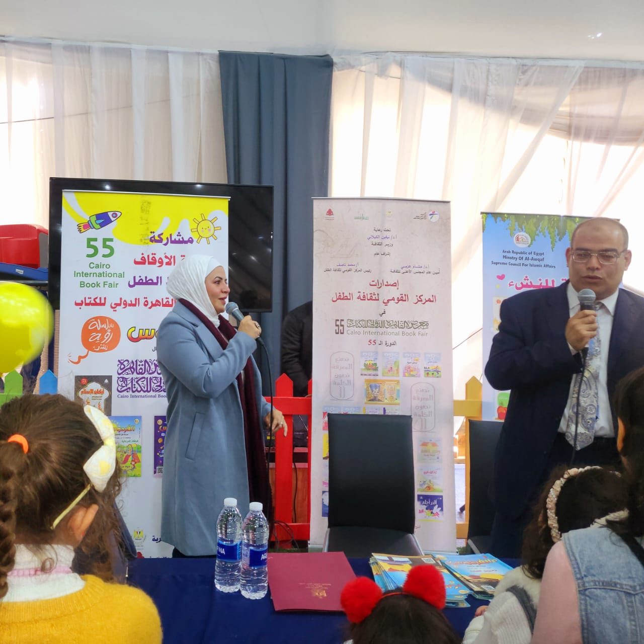 في إطار البرنامج التثقيفي للطفل، واهتمامًا من وزارة الأوقاف ‏والمجلس الأعلى للشئون الإسلامية بقضايا المجتمع وفهمها فهمًا صحيحًا، ‏ومساهمة منها في وضع لبنة جديدة تهدف إلى الاهتمام بالطفل وحقه في ‏الوعي والتثقيف، شاركت وزارة الأوقاف والمجلس الأعلى للشئون الإسلامية ‏بالتعاون مع وزارة الثقافة والهيئة المصرية العامة للكتاب في الفعاليات التثقيفية ‏للطفل بالصالة المخصصة بمعرض القاهرة الدولي للكتاب في دورته الخامسة ‏والخمسين، حيث أقيمت اليوم الأربعاء الموافق31/ 1/ 2024م خامس الفعاليات التثقيفية للطفل، وكانت فعالية اليوم بعنوان: “مهنتك إيه؟”  بمشاركة الأستاذ/ عبد الله المحمدي مدير عام الشئون القانونية بالمجلس الأعلى للشئون الاسلامية، وذلك بحضور الدكتورة/ هدى حميد مدير عام التحرير والنشر ومسئول ملف الطفل بوزارة الأوقاف، والأستاذة/ علية رضا إسماعيل أخصائي التصميم في إدارة التحرير والنشر، وبحضور جمع كبير من الأطفال وأولياء الأمور والزائرين للمعرض لجناح الطفل.
