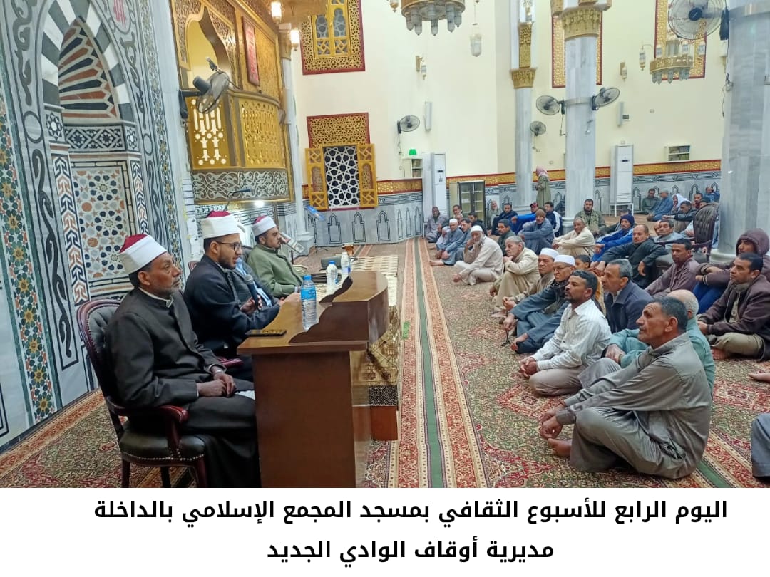 وفي مديرية أوقاف الوادي الجديد أقيم الأسبوع الثقافي بمسجد المجمع الإسلامي بالداخلة، حاضر فيه د/ علي رمضان محمد مدرس الحضارة والتاريخ بكلية اللغة العربية جامعة الأزهر بأسيوط، والشيخ/ أحمد حنفي أبو بكر إمام وخطيب ومدرس، والقارئ الشيخ/ عبد الله عبد السلام قارئًا، والمبتهل الشيخ/ منصور محمد حسين مبتهلًا، بحضور جمع غفير من رواد المسجد.