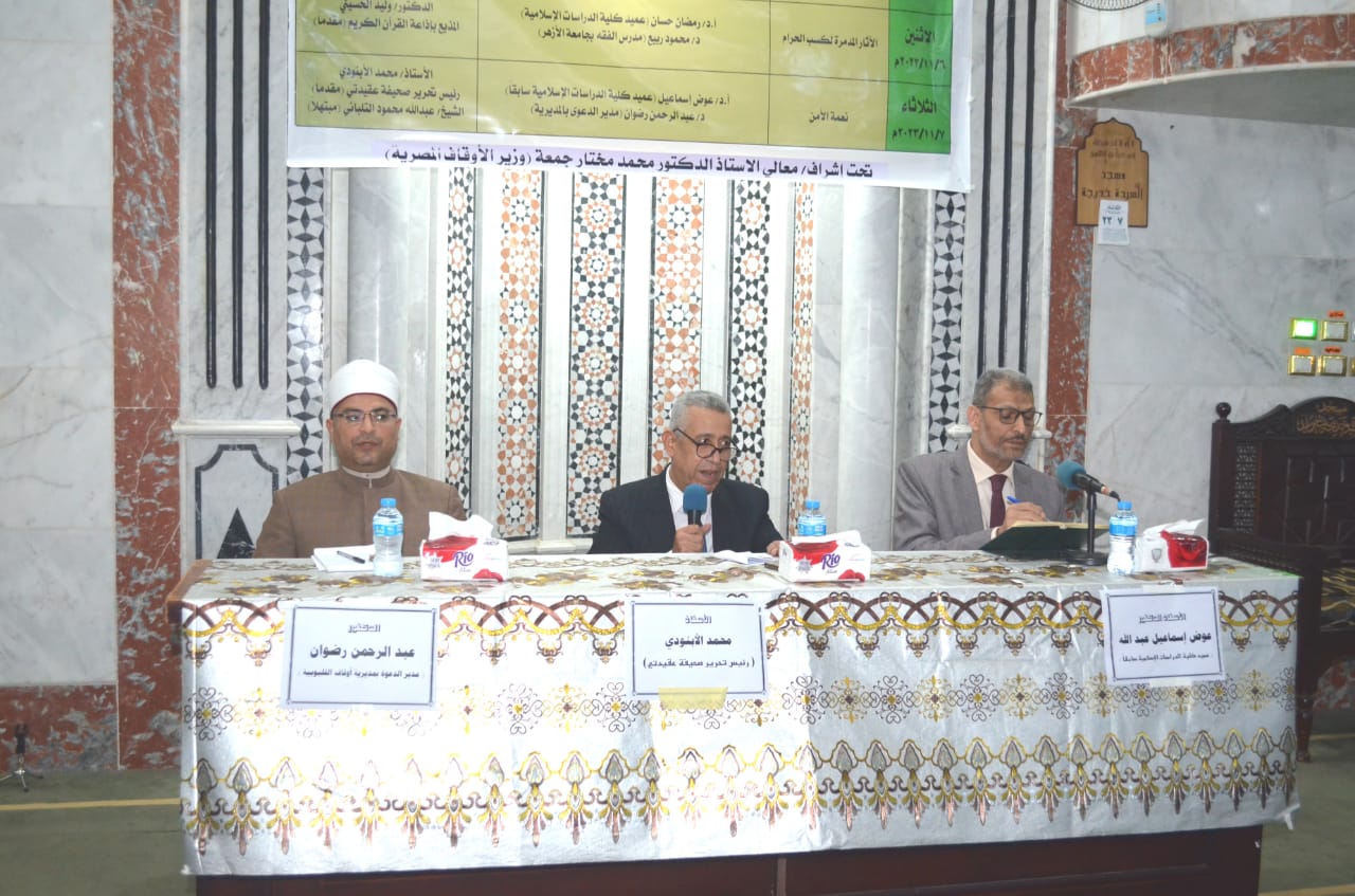 في إطار الدور التثقيفي الذي تقوم به وزارة الأوقاف اختتمت فعاليات الأسبوع الدعوي بمسجد السيدة خديجة بمدينة العبور بمحافظة القليوبية اليوم الثلاثاء ٧/ ١١/ ٢٠٢٣م بعنوان: “نعمة الأمن”، حاضر فيه الأستاذ الدكتور/ عوض إسماعيل عميد كلية الدراسات الإسلامية والعربية السابق، والدكتور/ عبد الرحمن رضوان مدير الدعوة بمديرية أوقاف القليوبية، وقدم له الأستاذ/ محمد الأبنودي رئيس تحرير صحيفة عقيدتي، والمبتهل الشيخ/ عبد الله محمود التلباني مبتهلا، وبحضور الشيخ/ بشرى محمد عبد الغفار مدير إدارة أوقاف العبور، والشيخ/ حسن أبو سنة مفتش بالإدارة، والشيخ/ سيد عبد النظير هريدي مفتش بالإدارة، وجمع غفير من رواد المسجد.