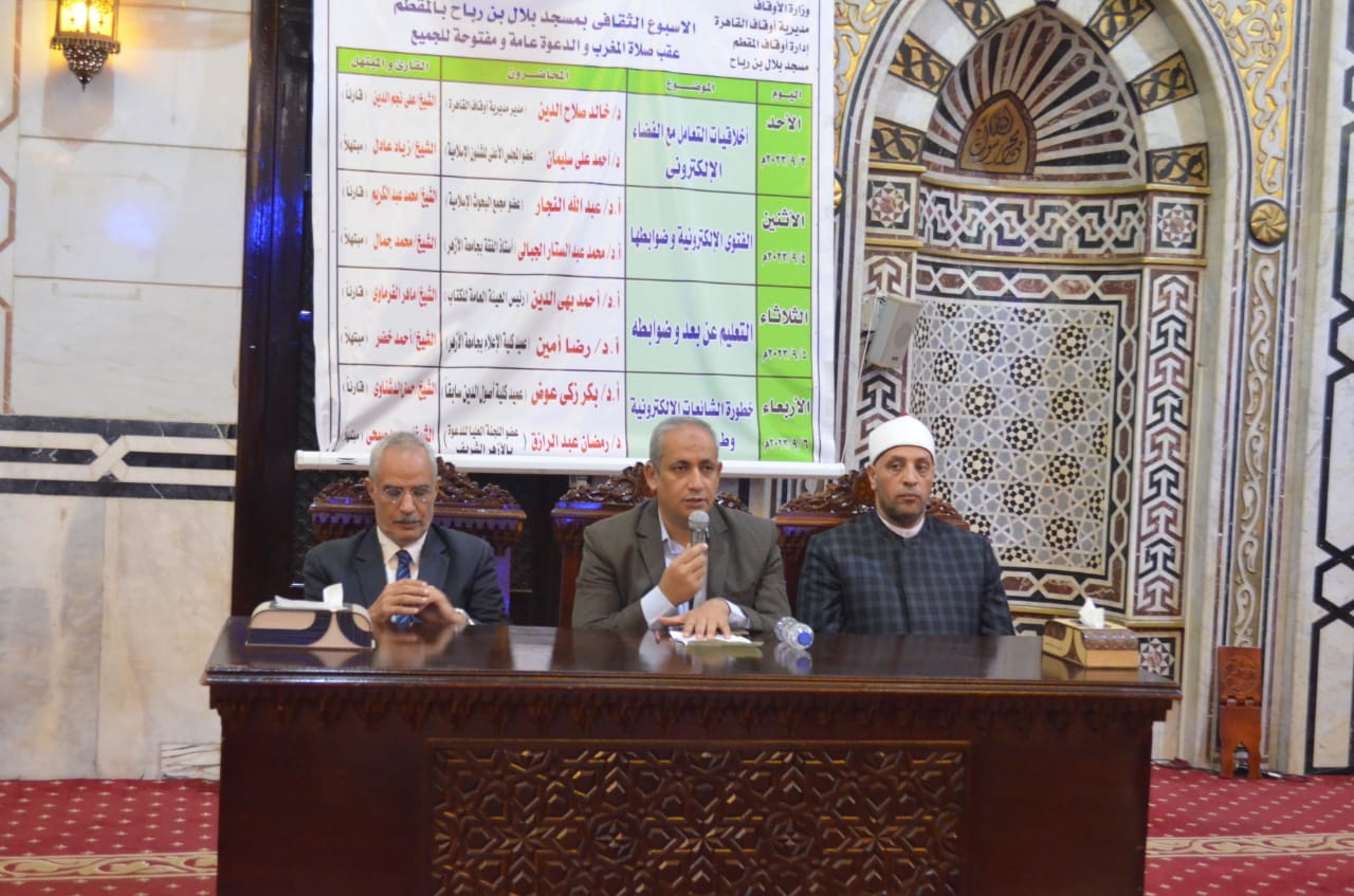 في إطار الدور التثقيفي الذي تقوم به وزارة الأوقاف اختتمت فعاليات الأسبوع الثقافي من مسجد بلال بالمقطم اليوم الأربعاء 6/ 9/ 2023م، بعنوان: “خطورة الشائعات الإلكترونية وطرق مواجهتها”، حاضر فيه الأستاذ الدكتور/ بكر زكي عوض عميد كلية أصول الدين سابقا، والدكتور/ رمضان عبد الرازق عضو اللجنة العليا للدعوة بالأزهر الشريف، وقدم له الأستاذ/ محمد جمعة المذيع بإذاعة القرآن الكريم، وكان فيه القارئ والمبتهل الشيخ/ محمود صوفي قارئًا، ومبتهلا، وبحضور الدكتور/ سعيد حامد مدير الدعوة بمديرية أوقاف القاهرة، والدكتور/ أسامة إسماعيل مدير إدارة أوقاف المقطم، وجمع غفير من رواد المسجد.