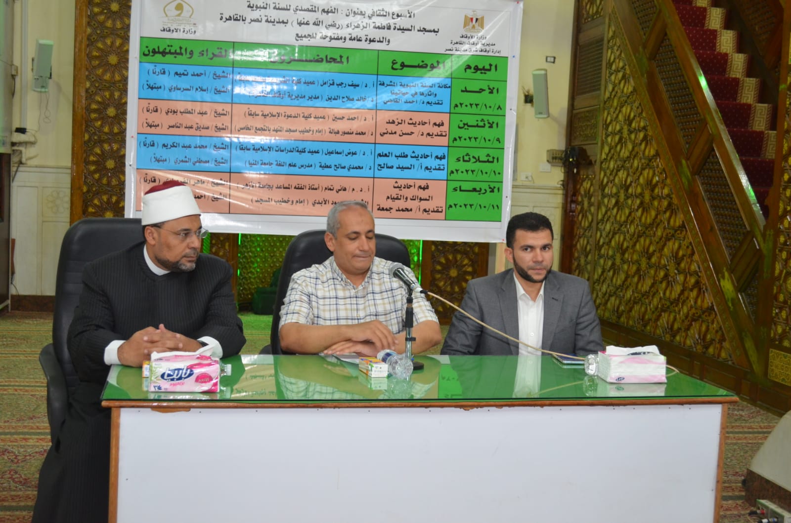 في إطار الدور التثقيفي الذي تقوم به وزارة الأوقاف اختتمت فعاليات الأسبوع الثقافي من مسجد فاطمة الزهراء (رضي الله عنها) بمدينة نصر بالقاهرة الأربعاء ١١ / ١٠/ ٢٠٢٣م تحت عنوان: “فهم أحاديث السواك والقيام”، حاضر فيه أ.د.م/ هاني تمام أستاذ الفقه المساعد بجامعة الأزهر، والشيخ/ محمود الأبيدي إمام وخطيب المسجد، وقدم له الأستاذ/ محمد جمعة المذيع بإذاعة القرآن الكريم، وكان فيها القارئ الشيخ/ ماهر الفرماوي قارئًا، والمبتهل الشيخ/ كمال أبو عرب مبتهلا، وبحضور الدكتور/ محمود خليل وكيل مديرية أوقاف القاهرة، والدكتور/ سعيد حامد مدير الدعوة بمديرية أوقاف القاهر، والشيخ/ سيد حمودة مدير إدارة شرق مدينة نصر، والشيخ/فتحي الجوهري المفتش بالإدارة، وجمع غفير من رواد المسجد.