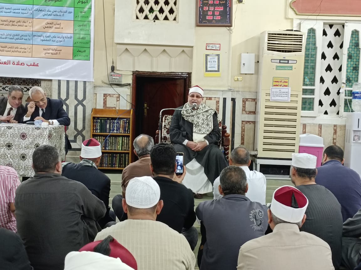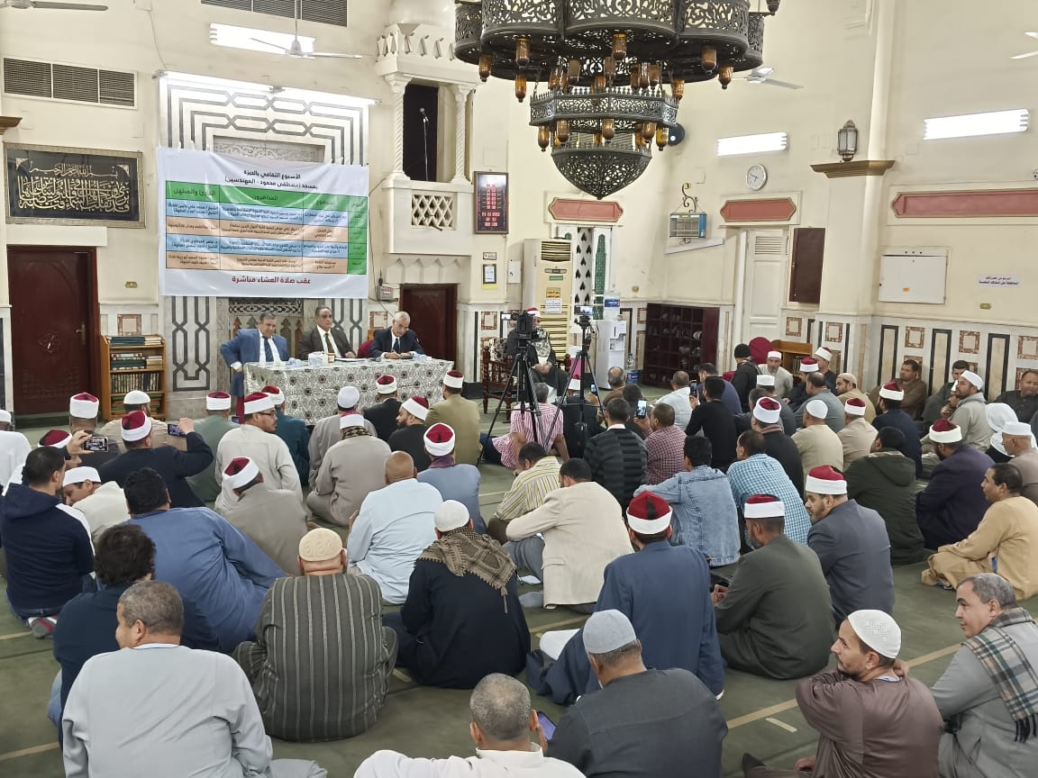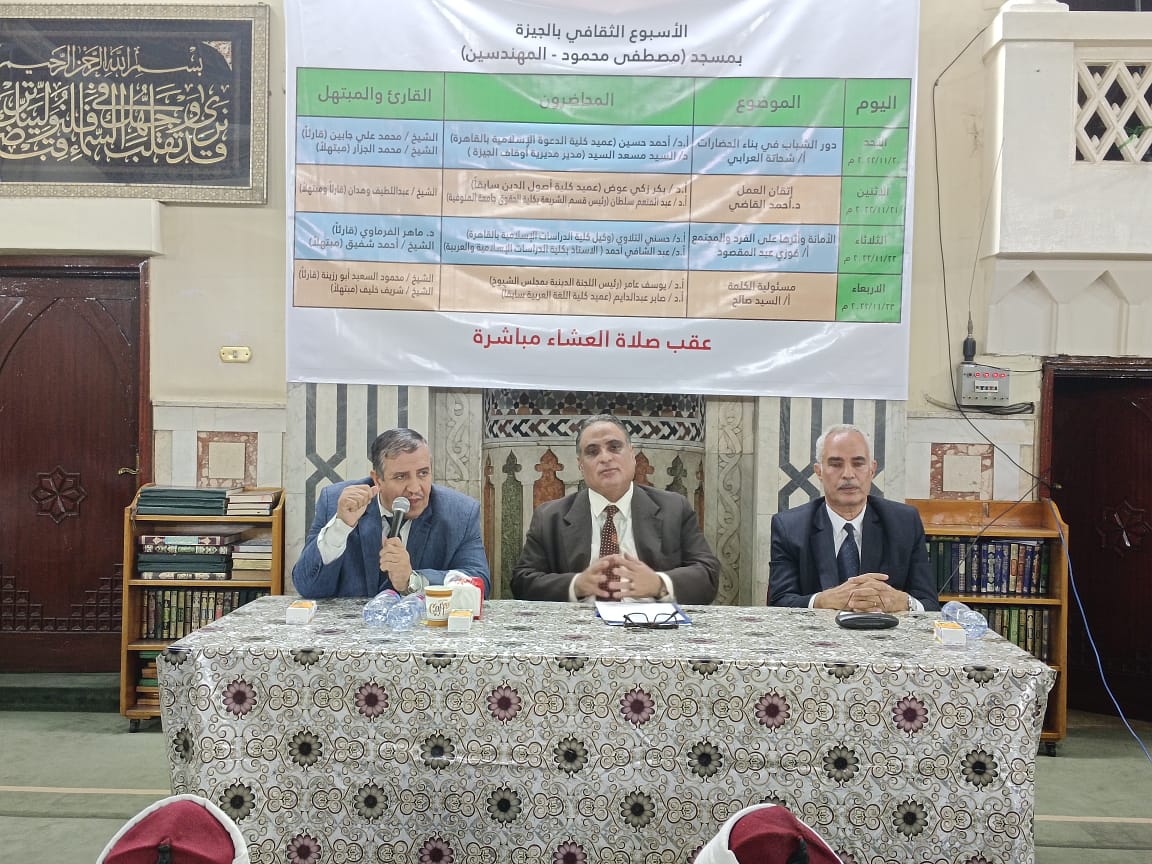 في إطار الدور التثقيفي الذي تقوم به وزارة الأوقاف انطلقت فعاليات اليوم الثاني من الأسبوع الثقافي الرئيسي بمسجد (الدكتور/ مصطفى محمود بالمهندسين بمحافظة الجيزة) اليوم الاثنين 21/ 11/ 2022م تحت عنوان: “إتقان العمل” حاضر فيه أ.د/ بكر زكي عوض عميد كلية أصول الدين سابقا، و أ.د/ عبد المنعم سلطان رئيس قسم الشريعة بكلية الحقوق جامعة المنوفية، وقدم له الدكتور/ أحمد القاضي المذيع بإذاعة القرآن الكريم، وكان فيه قارئا ومبتهلا الشيخ/ عبد اللطيف وهدان، وبحضور الدكتور/ صبري الغياتي مدير الدعوة بمديرية أوقاف الجيزة، والدكتور/ أحمد أبو طالب مسئول الثقافة والإرشاد بالمديرية، وجمع غفير من رواد المسجد.