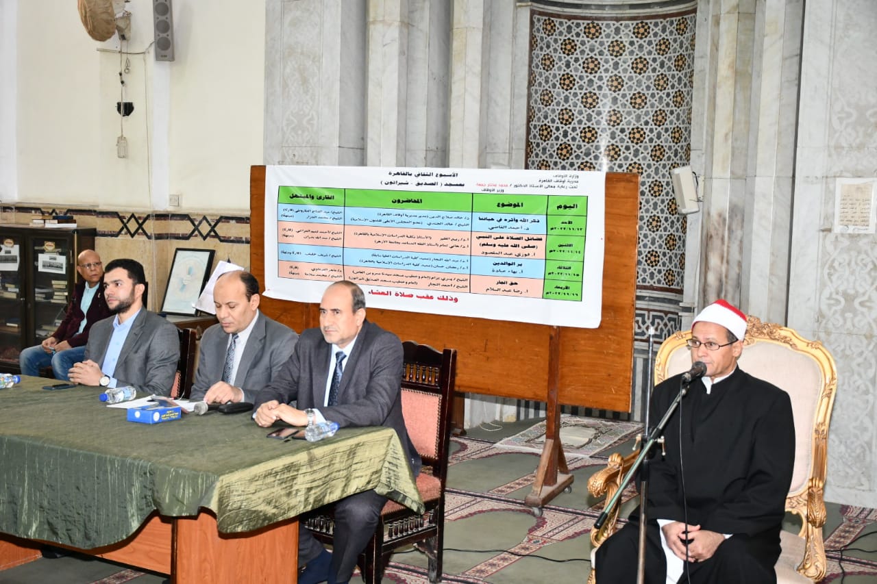 في إطار الدور التثقيفي الذي تقوم به وزارة الأوقاف انطلقت فعاليات اليوم الثاني من الأسبوع الثقافي الرئيسي بمسجدي (الصديق شيراتون بالقاهرة، والاستقامة بالجيزة) اليوم الاثنين ١٤/ ١١/ ٢٠٢٢م تحت عنوان: “فضائل الصلاة على النبي (صلى الله عليه وسلم)” حاضر في مسجد الصديق بشيراتون كل من: أ.د/ ربيع الغفير الأستاذ بكلية الدراسات الإسلامية والعربية بالقاهرة، وأ.د/ هاني تمام أستاذ الفقه المساعد بجامعة الأزهر، وقدم له الأستاذ/ فوزي عبد المقصود المذيع بإذاعة القرآن الكريم، وكان فيه القارئ الشيخ/ محمد السيد قارئًا، والمبتهل الشيخ/ عبد الله بدران مبتهلا، وبحضور الدكتور/ محمود خليل وكيل مديرية أوقاف القاهرة، والدكتور/سعيد حامد مبروك مدير الدعوة بمديرية أوقاف القاهرة.