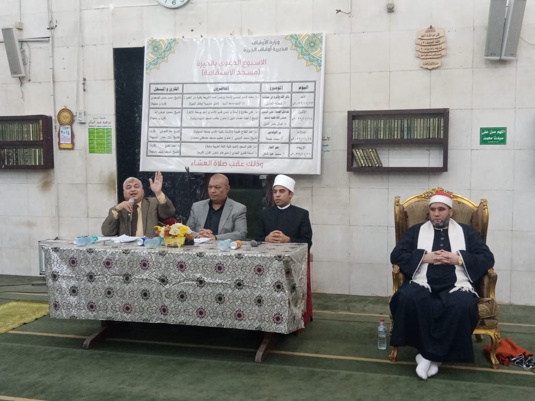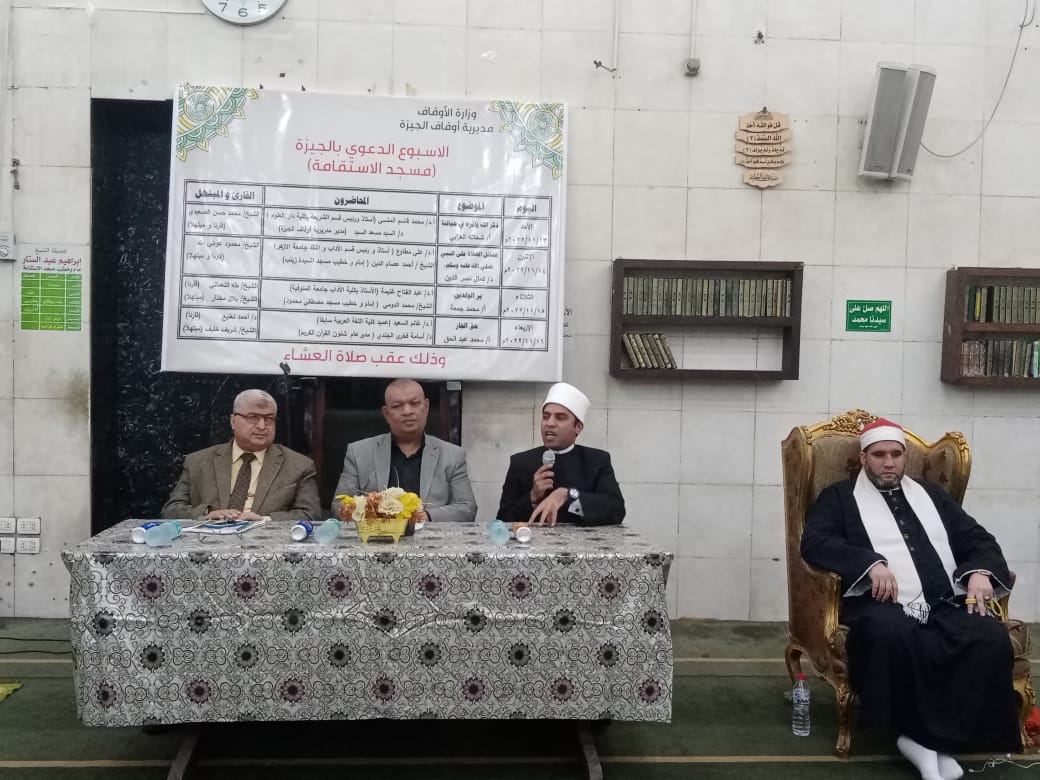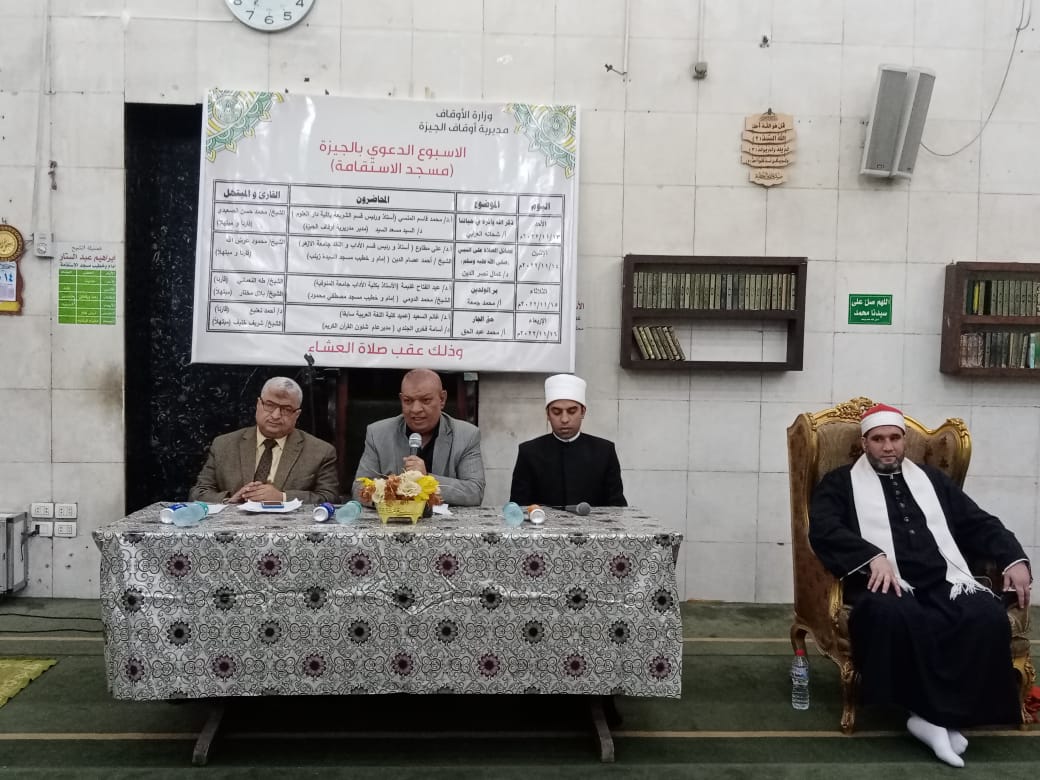 كما حاضر في مسجد الاستقامة كل من: الأستاذ الدكتور/ علي طايع أستاذ ورئيس قسم الأدب والنقد بجامعة الأزهر، والشيخ/ أحمد عصام الدين فرحات الموجي إمام وخطيب مسجد السيدة زينب (رضي الله عنها) بالقاهرة، وقدم له الدكتور/ كمال نصر الدين المذيع بإذاعة القرآن الكريم، وكان فيه القارئ الشيخ/ محمود عوض الله قارئًا ومبتهلًا.