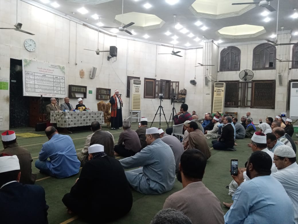 وفي كلمته أكد الشيخ/ أحمد فرحات أن حلاوة الإيمان لا تأتي إلا باتباع النبي (صلى الله عليه وسلم) قال النبي (صلى الله عليه وسلم): “ذاقَ طعمَ الإيمانِ من رضيَ باللَّهِ ربًّا وبالإسلامِ دينًا وبمحمَّدٍ صلَّى اللَّهُ عليه وسلم نبيا”، مؤكدا أن كثرة الصلاة والسلام على النبي (صلى الله عليه وسلم) تغفر الذنوب وتفرج الكروب، فعن أبي بن كعب (رضي الله عنه) أنه قال للنبي (صلى الله عليه وسلم): يا رسول الله إني أكثر الصلاة عليك، فكم أجعل لك من صلاتي؟ فقال: ما شئت، قال: قلت: الربع؟ قال: ما شئت، فإن زدت فهو خير لك، قلت: النصف؟ قال: ما شئت، فإن زدت فهو خير لك، قال: قلت: فالثلثان؟ قال: ما شئت، فإن زدت فهو خير لك، قلت: أجعل لك صلاتي كلها؟ قال: إذًا تكفى همك ويغفر لك ذنبك.