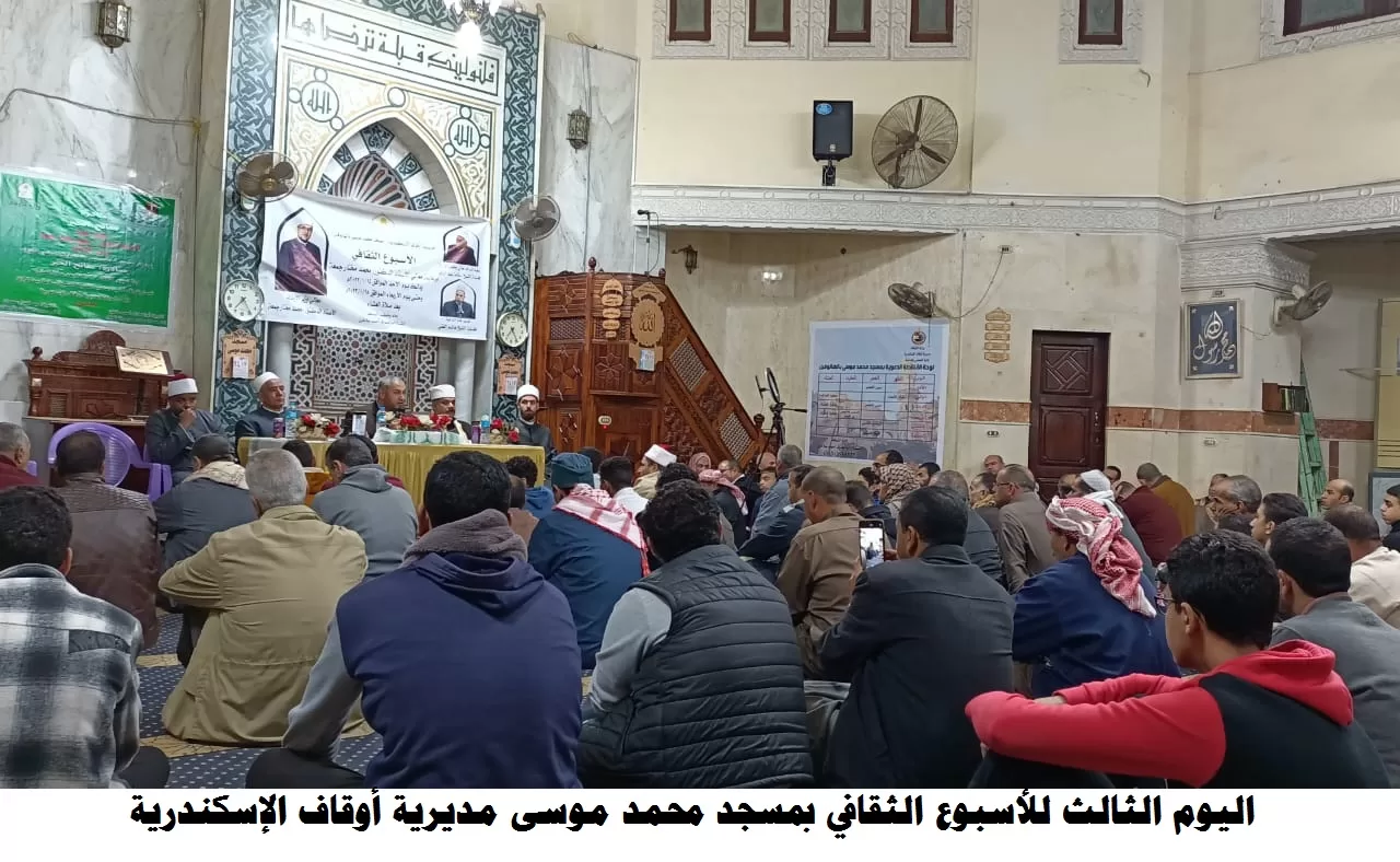 وفي مديرية أوقاف الإسكندرية أقيم الأسبوع الثقافي بمسجد محمد موسى بالهانوفيل، حاضر فيه د/ محمد عباس المغني أستاذ مساعد الدعوة والعقيدة بكليه أصول الدين، والشيخ/ سلامه محمود عبد الرازق نجم مدير مديرية أوقاف الإسكندرية، والقارئ الشيخ/ محمود بكر عثمان قارئًا، والمبتهل الشيخ/ محمد عرفات يوسف مبتهلًا، بحضور جمع غفير من رواد المسجد.
