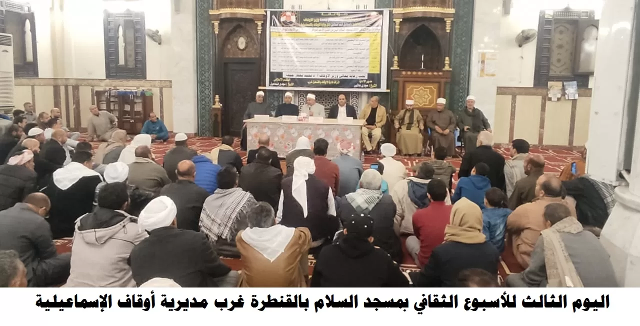 وفي مديرية أوقاف الإسماعيلية أقيم الأسبوع الثقافي بمسجد السلام بالقنطرة غرب، حاضر فيه أ.د/ محمد المتولي علي فاضل أستاذ الحديث المساعد بجامعة الأزهر، والشيخ/ إسماعيل أحمد إسماعيل مدير مديرية أوقاف الإسماعيلية، وقدم له الشيخ/ مجدي إسماعيل، والقارئ الشيخ/ محمود السيد عبد العال قارئًا، والمبتهل الشيخ/ عمر فرحان عبد المجيد مبتهلًا، بحضور الدكتور/ محمد عبد المعبود مدير الدعوة بالمديرية، والشيخ/ مجدي عاشور مدير إدارة أوقاف القنطرة غرب، وجمع غفير من رواد المسجد.