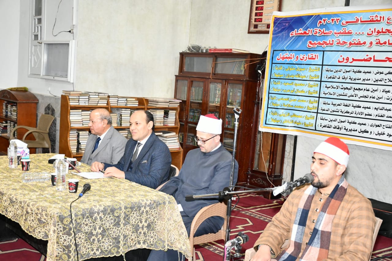 في إطار الدور التثقيفي الذي تقوم به وزارة الأوقاف عُقدت فعاليات اليوم الثالث من الأسبوع الدعوي بمسجد المراغي بمدينة حلوان اليوم الثلاثاء 17/ 1/ 2023م بعنوان: “الأمانة”، حاضر فيه الأستاذ الدكتور/ صابر عبد الدايم عميد كلية اللغة العربية سابقًا، والدكتور/ أسامة فخري الجندي مدير عام شئون القرآن الكريم، وقدم له الأستاذ/ فوزي عبد المقصود المذيع بإذاعة القرآن الكريم، وكان فيه القارئ والمبتهل الشيخ/ محمد سلامة قارئًا ومبتهلا، وبحضور الدكتور/ سعيد حامد مبروك مدير الدعوة بمديرية أوقاف القاهرة، والشيخ/ كامل محمد أحمد مدير إدارة حلوان، وجمع غفير من رواد المسجد.