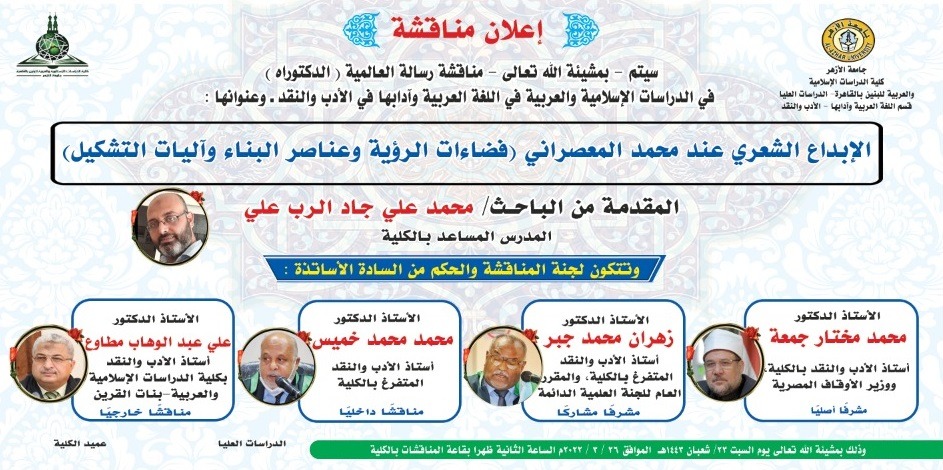 يرأس معالي أ.د/ محمد مختار جمعة وزير الأوقاف غدًا السبت 26/ 3/ 2022م مناقشة رسالة دكتوراه في الأدب والنقد حول موضوع : “الإبداع الشعري عند محمد المعصراني .. فضاءات الرؤية وعناصر البناء وآليات التشكيل” ، بكلية الدراسات الإسلامية والعربية بنين قسم اللغة العربية وآدابها ، للباحث/ محمد علي جاد الرب ، وتتكون لجنة المناقشة والحكم على الرسالة من كل من :