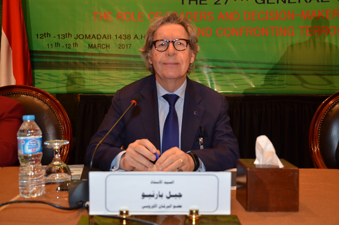 وفي كلمته أكد السيد/ جيل بارنيو عضو البرلمان الأوروبي أن العالم العربي هو الذي يدفع فاتورة الإرهاب ، وأن الدول العربية والإسلامية هي الأكثر تعرضًا للهجمات الإرهابية ، مشيرًا إلى أن إرهاب اليوم يختلف عن إرهاب الأمس لاستخدامه التقنية الحديثة، مقترحًا إنشاء هيكل ميداني لمواجهة الإرهاب والتطرف ، والعمل على نشر ثقافة السلام والمحبة.