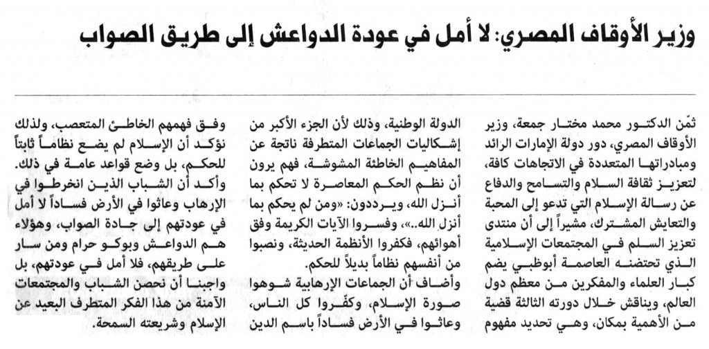 أبرزت صحف الإمارات ومواقعها الإلكترونية كلمة معالي وزير الأوقاف أ.د/ محمد مختار جمعة التي ألقاها في الجلسة الافتتاحية بمنتدى تعزيز السلم والتي أكد فيها على أهمية ترسيخ مفهوم الدولة الوطنية وفقه العيش المشترك, نذكر مما نشر :