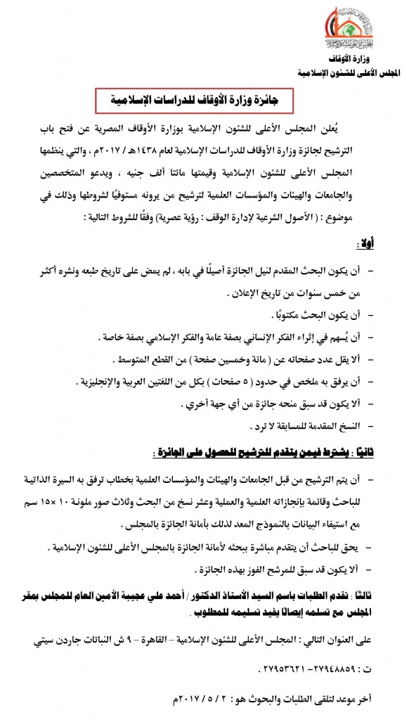 في اجتماعه اليوم الأربعاء 4 / 1 / 2017م مع أ.د/ أحمد عجيبة أمين عام المجلس الأعلى للشئون الإسلامية اعتمد معالي وزير الأوقاف أ.د/ محمد مختار جمعة شروط جائزة الأوقاف للدراسات الإسلامية مع فتح باب المشاركة لجميع الباحثين من جمهورية مصر العربية أو الباحثين من مختلف دول العالم.